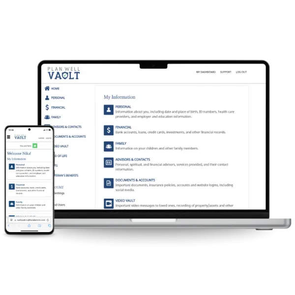 Plan Well Vault has partnered with My Life And Wishes™ to offer an innovative digital vault service that securely stores your important documents, such as wills, insurance policies, and financial records, in one accessible location. This service not only safeguards your documents but also provides peace of mind by ensuring that your loved ones can easily access your essential information when needed, simplifying estate planning and household management.